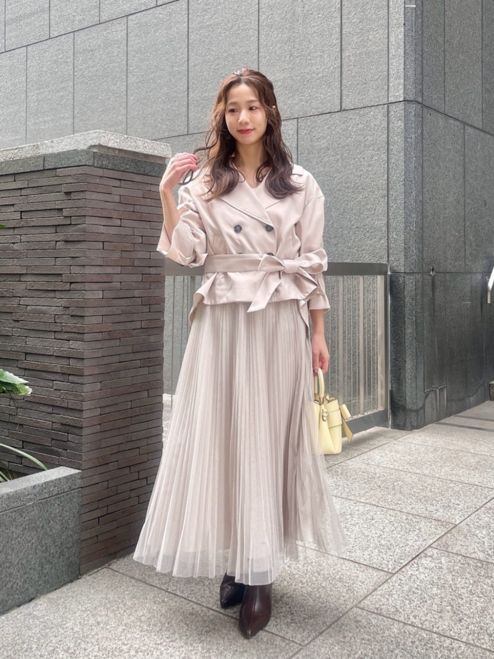 STAFF身長:153cm 【着用サイズ】アウター:S/スカート:PS 《ショートトレンチコート》 ●着心地・サイズ感 ⇒春のライトアウターにピッタリなショートトレンチコートです。 サラッとした裏地なしの生地なので、春先から夏前までロングシーズンお召しいただけます◎またリボンベルトを前にもってきてトップス風に着ると、今っぽく仕上がります♡ 《ラメプリーツスカート》 ●着心地・サイズ感 ⇒ 前回大人気だったシリーズが、SS仕様のカラバリ展開で再入荷です♡ 軽やかなチュール素材なのでシーズン問わず着れ、裏地付きなので透け感も気になりにくいです◎短丈ニットなどを合わせて、アウトスタイリングでコーデするのがオススメです。 身長153cmでPSサイズを着用しており、着丈は足首がしっかり見える長さです。またウエストゴム仕様なのでストレスフリーな着心地です◎