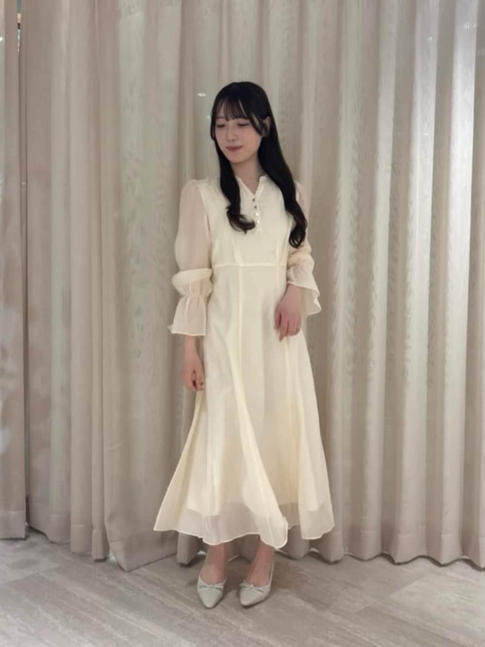 STAFF身長:152cm 【着用サイズ】 ワンピース : PS 《バックレースアップレディワンピース》 ふんわり軽く、ほんのり透け感のあるシアー素材が女性らしいやわらかな印象を演出してくれるワンピース♡広がりすぎない上品なシルエットに、バックレースアップでウエストラインの調整も可能◎一枚でさらっと着るだけで、春らしい華やかコーデが完成する主役アイテムです✨ ▶︎152cm/PSサイズ着用 : くるぶしより上の丈感 で、ヒールやパンプスはもちろん、フラットシューズでもバランスよく着ていただけます♡