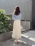 STAFF身長:158cm 【着用サイズ】ニット:S/スカート:PXS(PSS) 《コーディネートポイント》 春らしい柔らかなカラーでまとめた、上品フェミニンなスタイリング。 ブルーのボウタイニットは顔まわりを華やかに見せてくれる一枚。 甘くなりすぎない落ち着いた色味なので、大人フェミニンな印象で着ていただけます。 合わせたレーススカートは、裾の透け感が軽やかで春らしい雰囲気に。 すっきりとしたシルエットなので、トップスをインするとスタイルアップして見えるのもポイントです。 ⸻ 【着用感】 ●トップス(Sサイズ着用) コンパクトで程よく体に沿うシルエット。 ボトムにインしてももたつきにくく、すっきり着ていただけます。 さらっとした素材で肌触りが良く、長時間の着用でもベタつきのない着心地です。 首が詰まりすぎないのと手首のスリットにより抜け感が出るのもおすすめのポイントです✨ ●ボトムス(PXSサイズ着用) 158cmで足首が見えるくらいのミモレ丈。 フラットシューズでもバランスよく着られる丈感です。 ウエストは程よくフィットし、トップスをインしてもすっきり見えます。 しっかりした裏地付きで白でも透けが気にならず安心感があります。