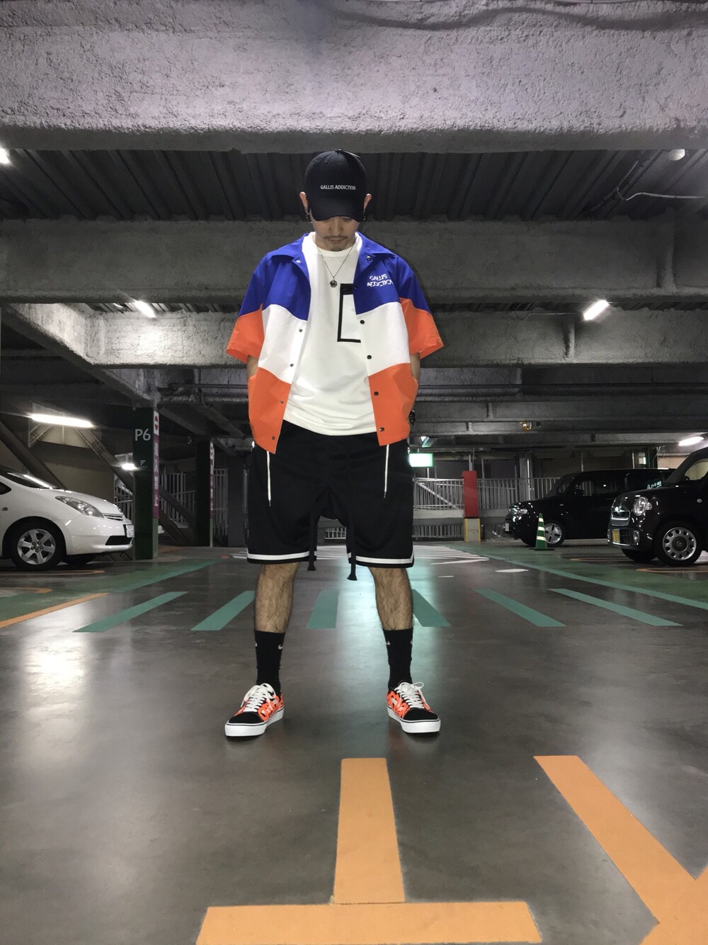 ショートパンツを先取りした軽快かつスポーティーなスタイル。 シャツとスニーカーのオレンジを合わせたのがポイント。