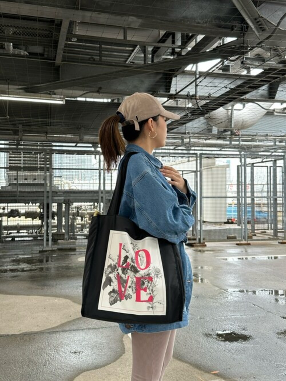 マスターのトートバッグ「【TREASURE TOPKAPI/トプカピ トレジャー】LOVE&PEACE ロゴプリント マーケット A4 トートバッグ」を使ったコーディネート