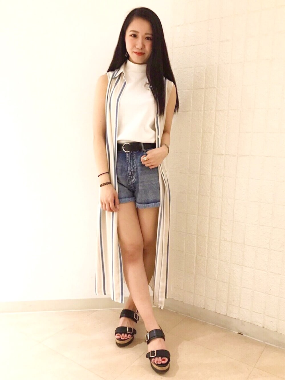ストライプワンピの ボタンを開けてガウン風に🎵 ロング丈なので ショーツとの相性バツグン◎です!