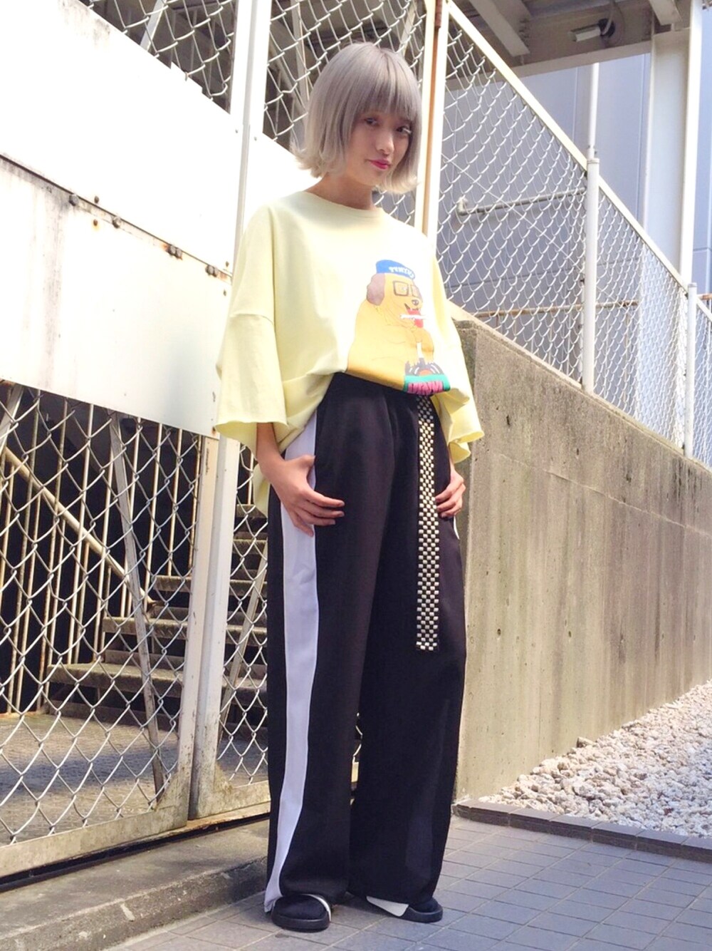 ビッグTをゆるめにイン◎ ラインパンツを合わせた PUNYUSらしいストリートコーデ♬ 人気のビニールドッグは アーティスト後藤徹也氏による オリジナルイラストです。