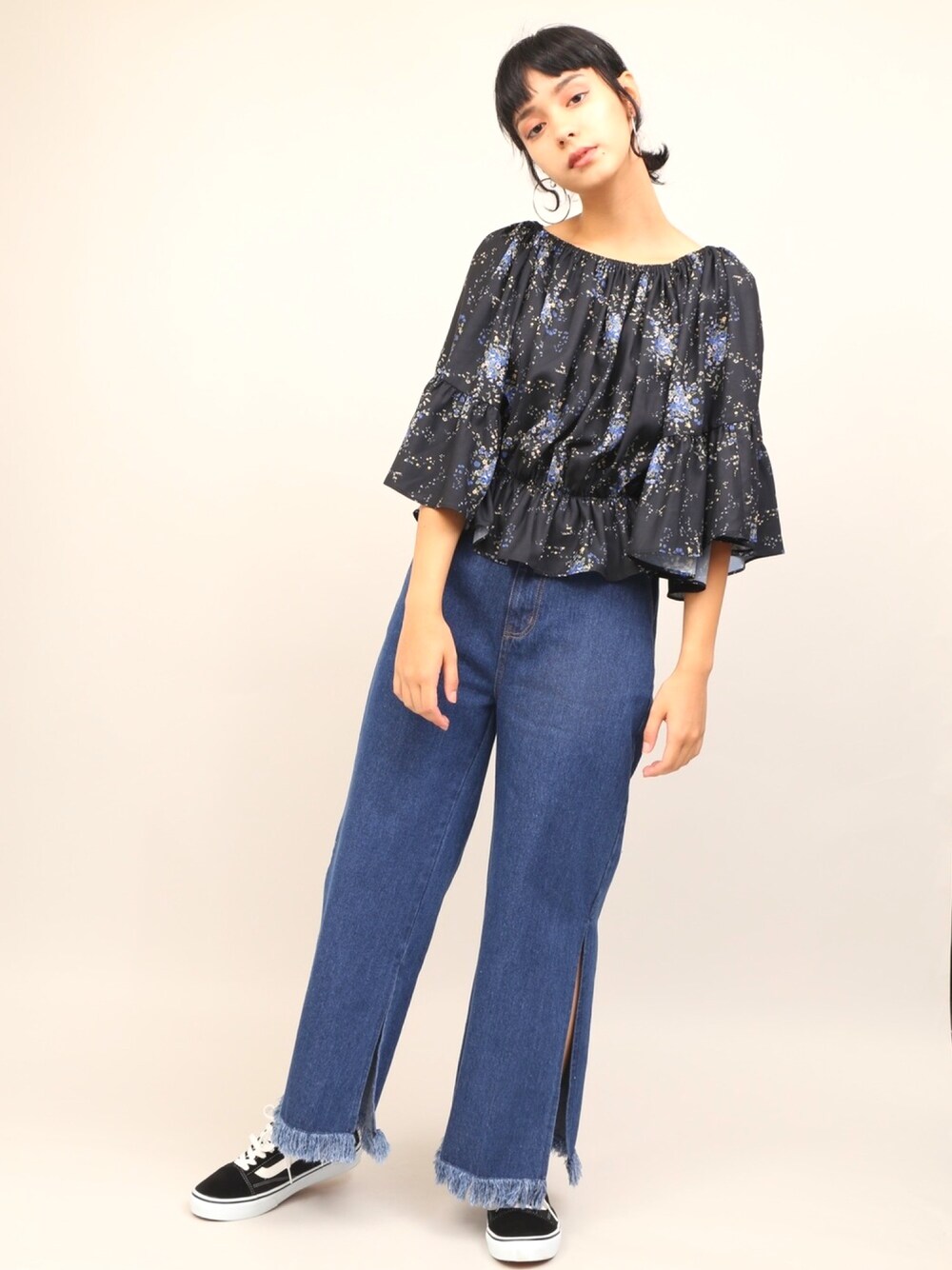 花柄オフショルブラウスを デニムとスニーカーで着くずし◎