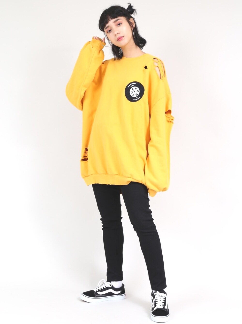 レコードモチーフにクラッシュ加工の 可愛さ満載のビッグスウェット◎! インナーに映えるパキっとカラーがおすすめです!