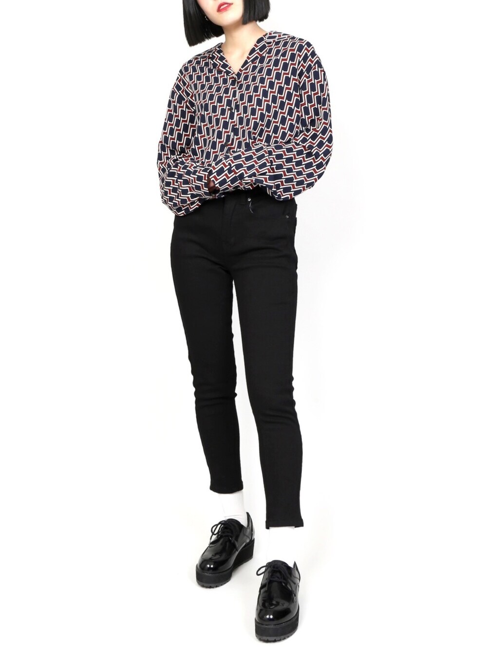 お目立ちシャツはタックインですっきりモードな着こなしに★ 開襟なのでボタンを開けてインナー合わせも◎