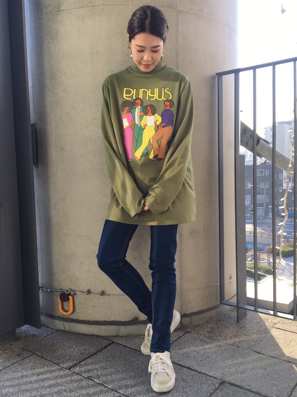 NONCHELEEE氏のディスコステップのイラストが印象的なハイネックロンT。 ルーズなシルエットデザインなので リラックスして着用可能♪スキニーやレギンスなど、 細身のボトムスとの合わせがオススメ。