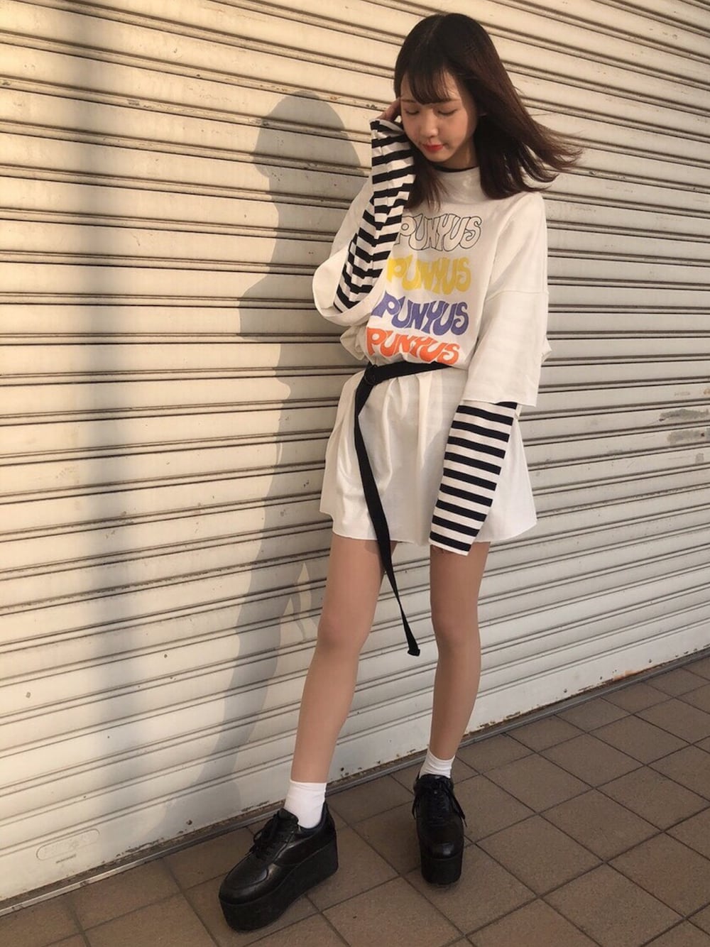 PUNYUS (PUNYUS)のTシャツ/カットソー「4連ロゴビッグTシャツ」を使ったコーディネート