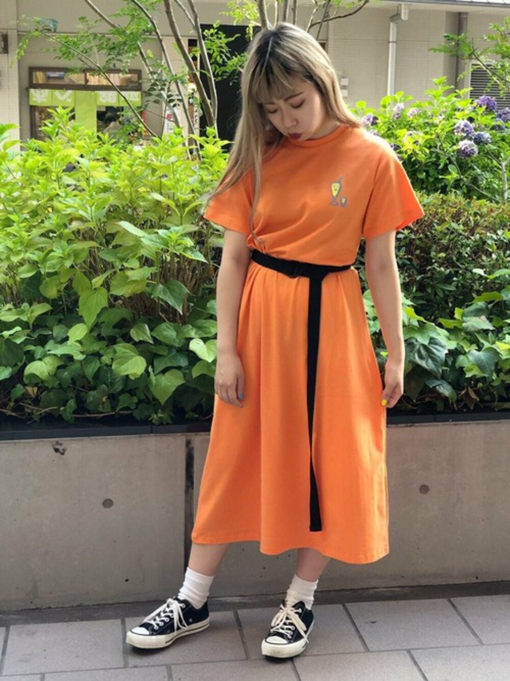 オレンジ系のワンピースを着用したレディースの夏コーディネートの1枚目の写真