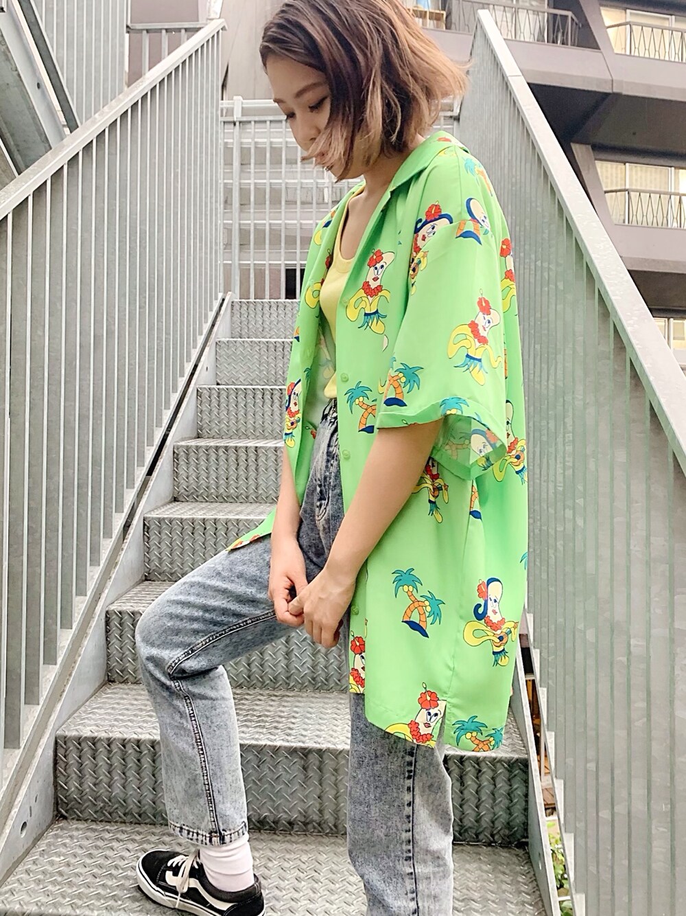 山崎若菜氏デザインイラストがプリントされたアロハシャツ。 シャツとしても羽織りとしても大活躍! ユニセックス着用もオススメです。 ボーイズデニムやスキニーなどの定番ボトムでもしっかりとこなれ感のあるスタイリングになります。 山崎若菜 Yamazaki Wakana 2010年よりフリーのイラストレーターとして活動。 桑沢デザイン研究所卒、TIS会員。 広告や書籍、漫画やWeb、 アパレルなど多方面で活躍中。