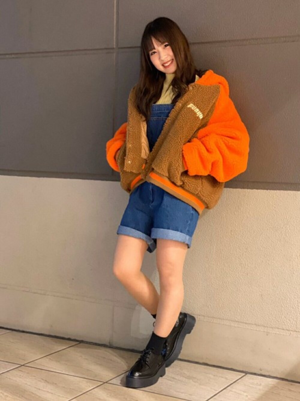 オレンジカラーが目を引くボアスタジャンは デニムアイテムと相性抜群♪ ボリュームのあるアウターに合わせるボトムスは ショート丈やスキニーなどでコンパクトにまとめると バランスよく着こなせます◎