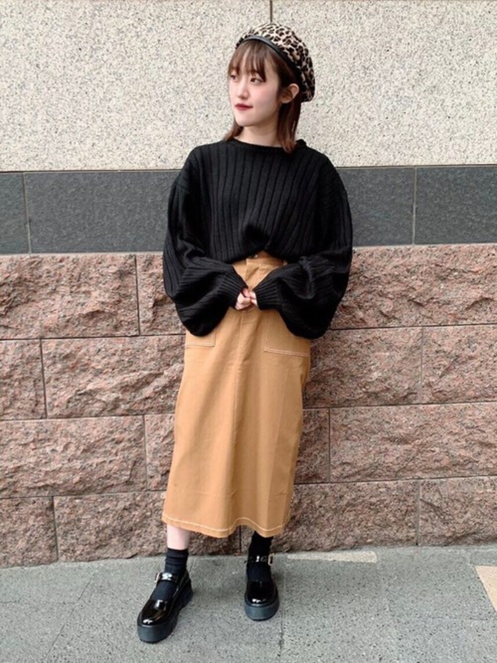 ゆったりしたボリュームスリーブニットはウエストインで ゆるすぎない大人カジュアルなスタイルに♡ レオパード柄のベレー帽がスタイリングのスパイスに♪