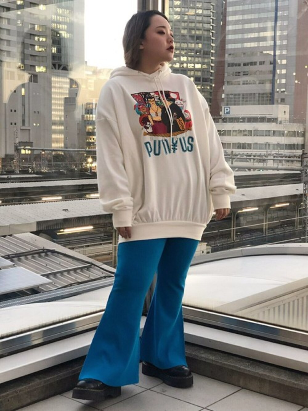PUNYUSらしいプリントパーカーに今季トレンドのリブフレアパンツを♪ 明るいブルーのフレアパンツは春夏スタイルの差し色として取り入れたいアイテムです♡