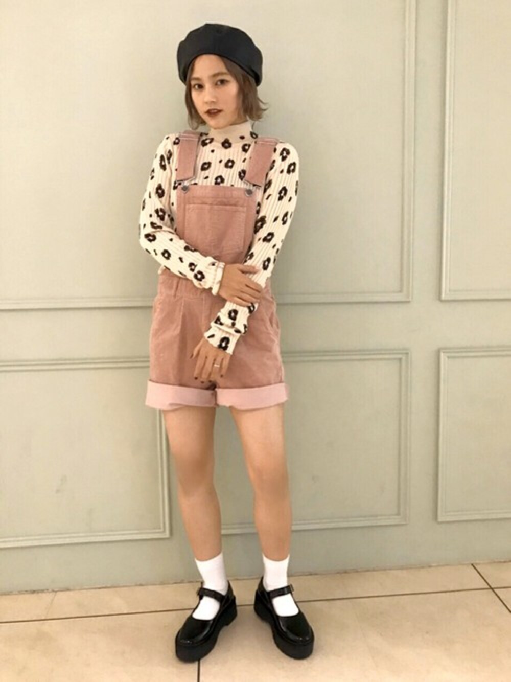 ライトピンクのコーデュロイサロペには レオパード柄のハイネックニットで甘辛MIX♡ 子供っぽくなりがちなショートサロペットには ピリッとスパイスの効いたアイテムをチョイス◎