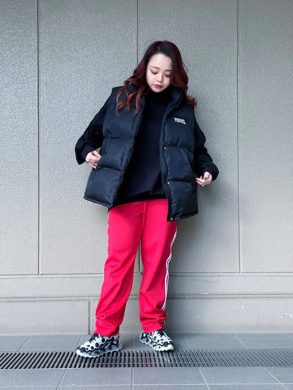 スウェット×ジャージパンツでラフなストリートコーデに。ダウンベストで防寒も◎