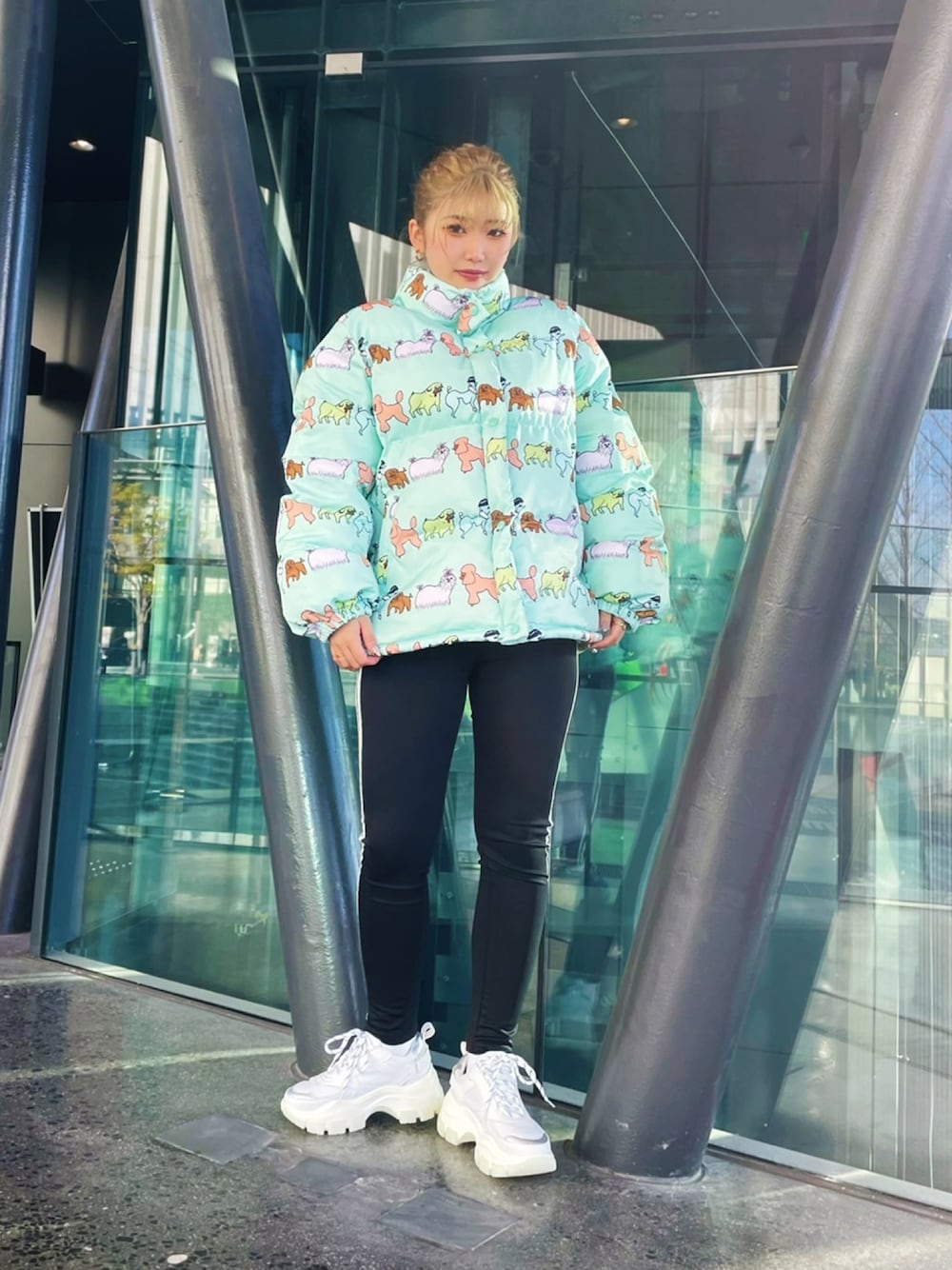 温かさバツグン!かわいさバツグン!クセのある可愛い犬柄が散りばめられたダウンジャケット☆