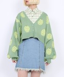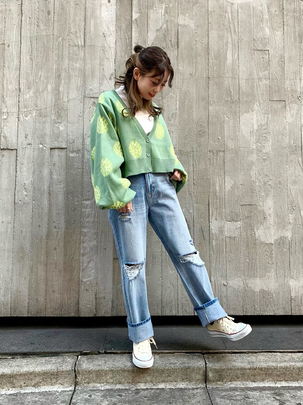 ボリューム袖のゆったりとした メロン柄がかわいいカーディガン🍈💚 ダメージデニムとあわせて甘くなりすぎない カジュアルガーリーなコーデに👖👟