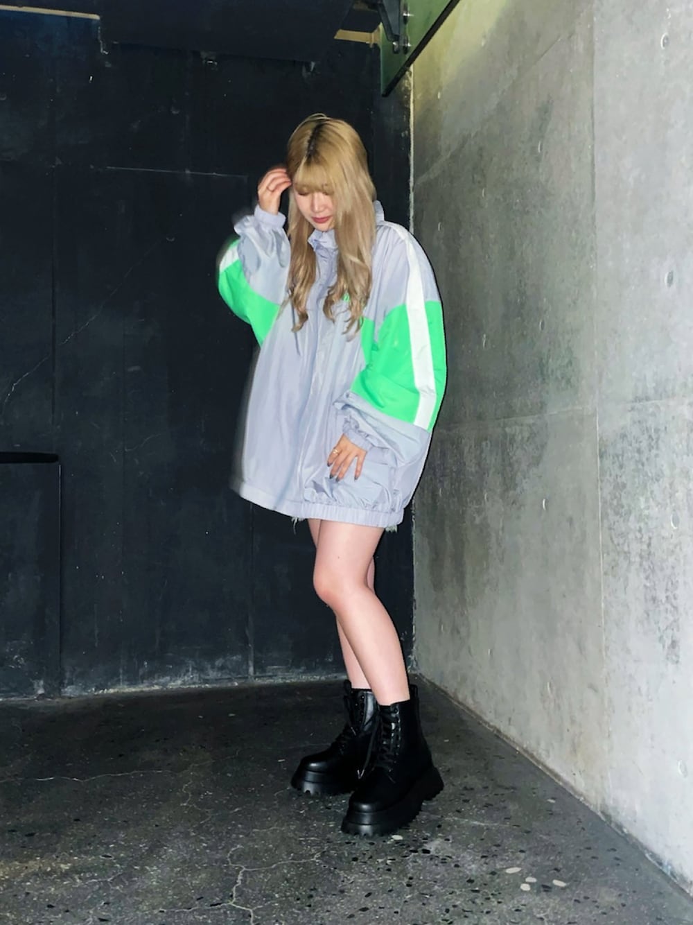 ナイロンジャケットをショートパンツと合わせてワンピ風に🤩 足元はブーツでクールに🌀
