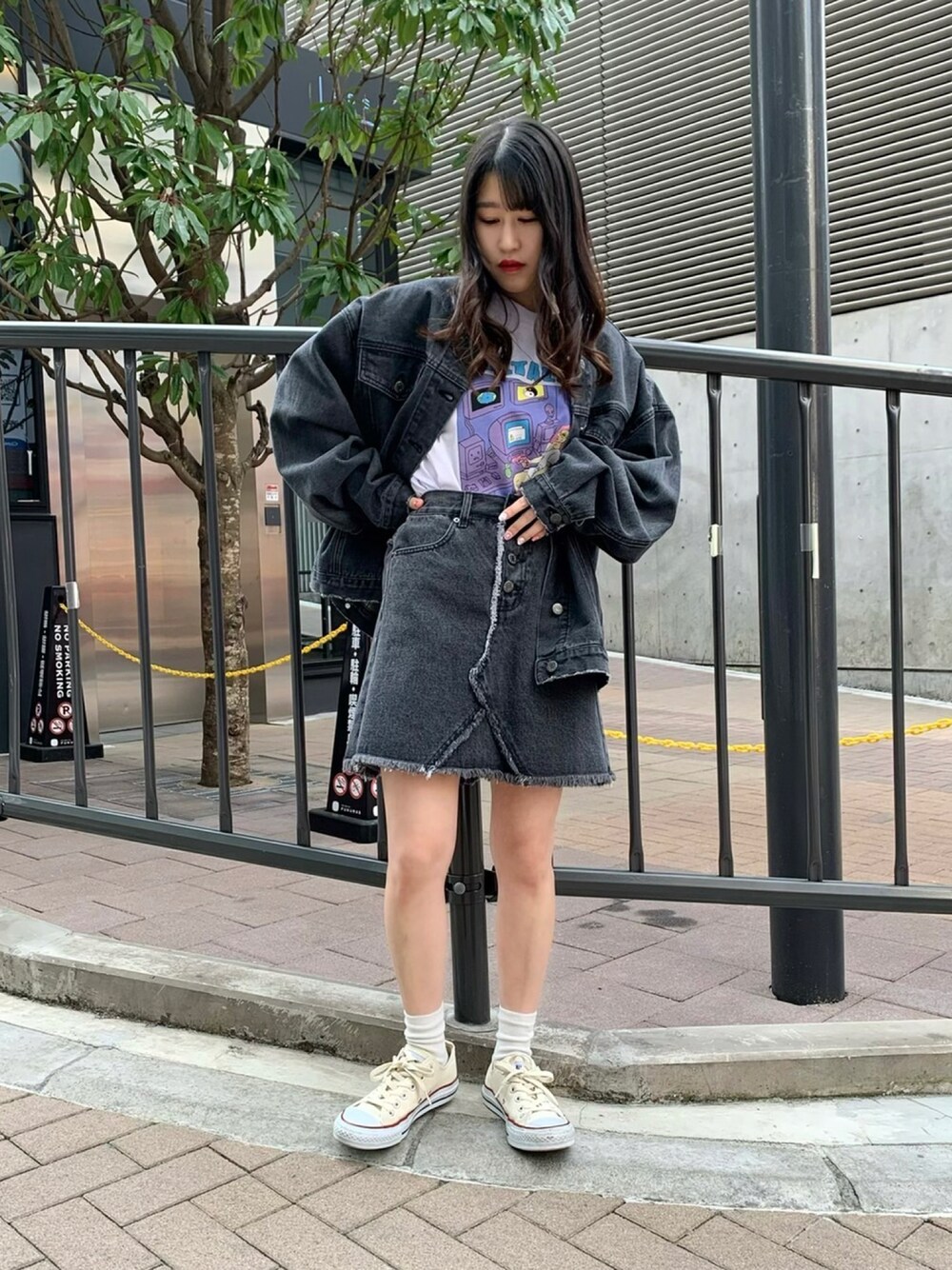 デニムのノーカラージャケットとミニスカートでセットアップコーデ🎶 薄手のデニムジャケットは暖かくなってきたこの時期にピッタリの羽織🌸