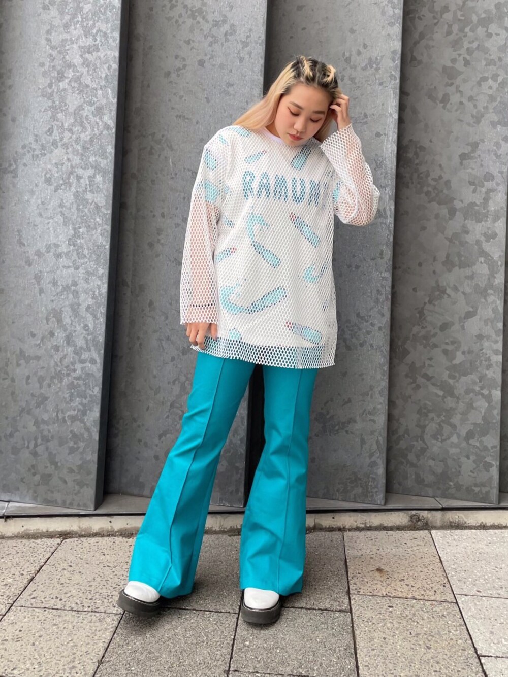 今期流行のメッシュトップスの中に総柄Tシャツがかわいい💙 ホワイトとブルーでまとめたさわやかコーデ🌊✨