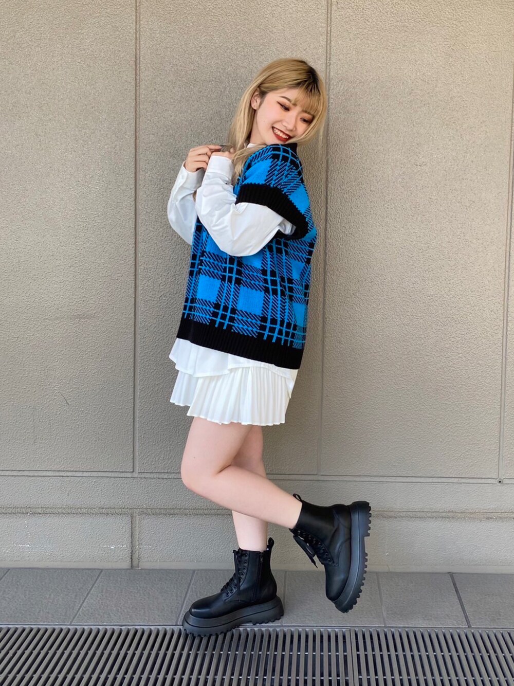 PUNYUS (PUNYUS)のベスト「チェックオーバーニットベスト」を使ったコーディネート