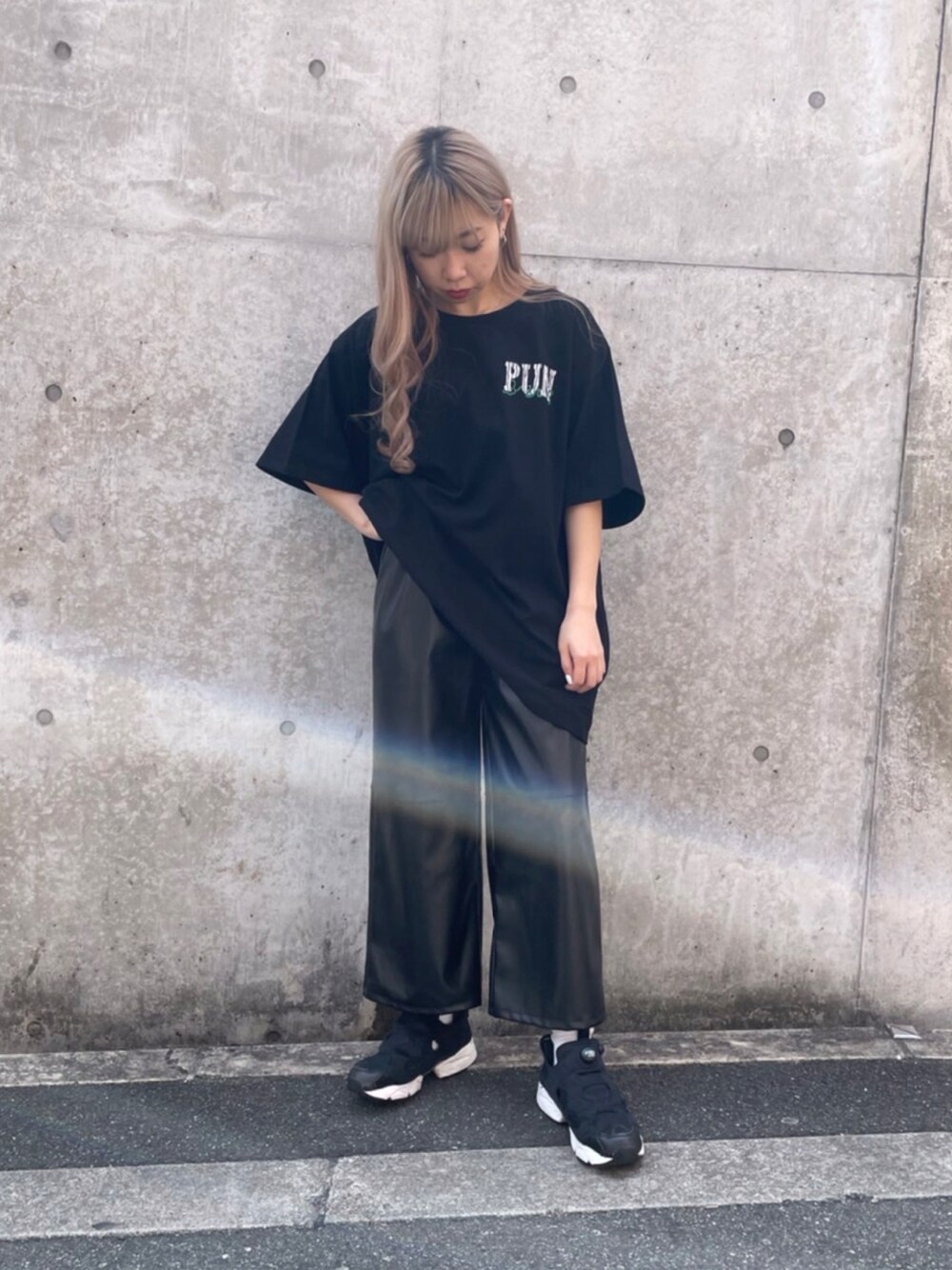 全身ブラックでまとめた初夏コーデ🖤 軽いアウターを合わせたりインナーにロンTをレイヤードしても可愛いコーデ♪ レザーのパンツでコーデにアクセントを⚡️