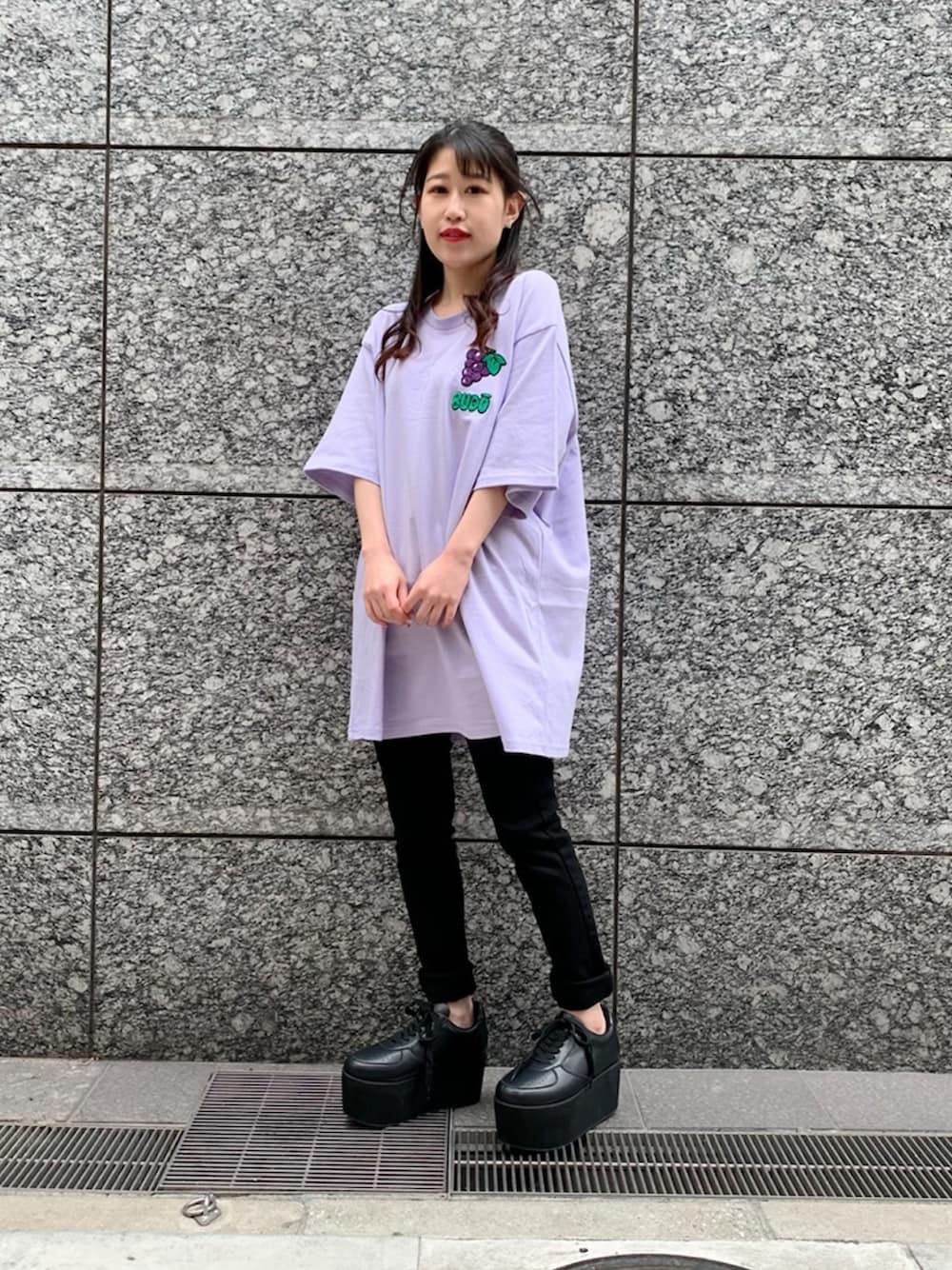 おしりまですっぽり隠れる大きめのTシャツはサラッと着れて合わせやすい1枚🍇 細身のパンツを合わせるとさらに足が細く見えます😍✨