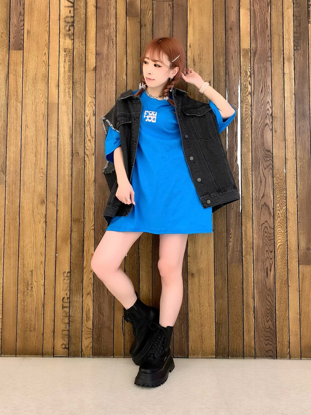 ビッグTにデニムJKTを羽織ったストリートガールコーデ🛹 デニムベストの個性的な刺繍がインパクト大🤩