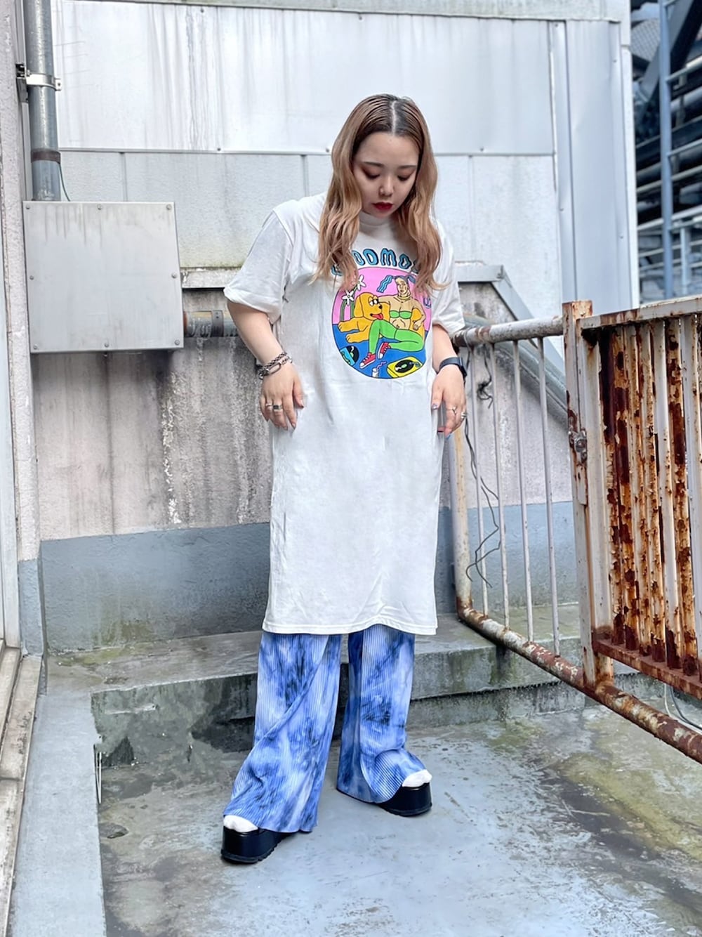 ゆったりシルエットのTシャツワンピに プリーツパンツを合わせて ホワイト×ブルーの爽やかコーデ💙 ワンピは1枚で着てもかわいよ🌊✨