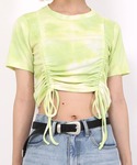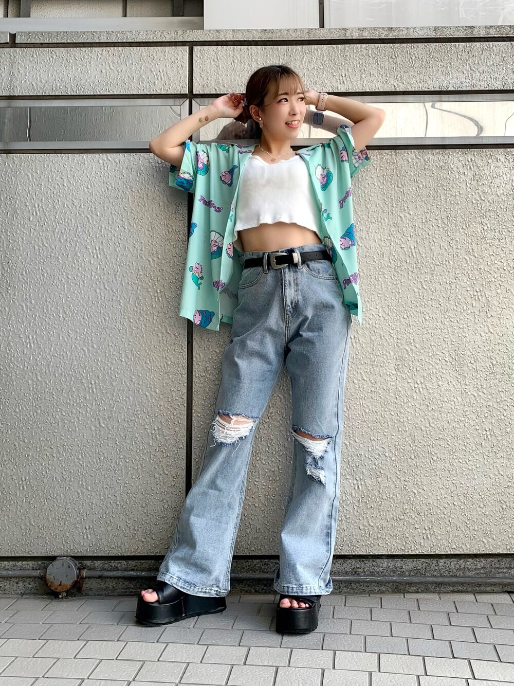 ショート丈のタンクトップに フレアパンツを合わせて脚長効果🦵✨ 羽織っているシャツは よく見ると貝殻に恐竜が入った ポップで可愛い柄に、、🐚💞