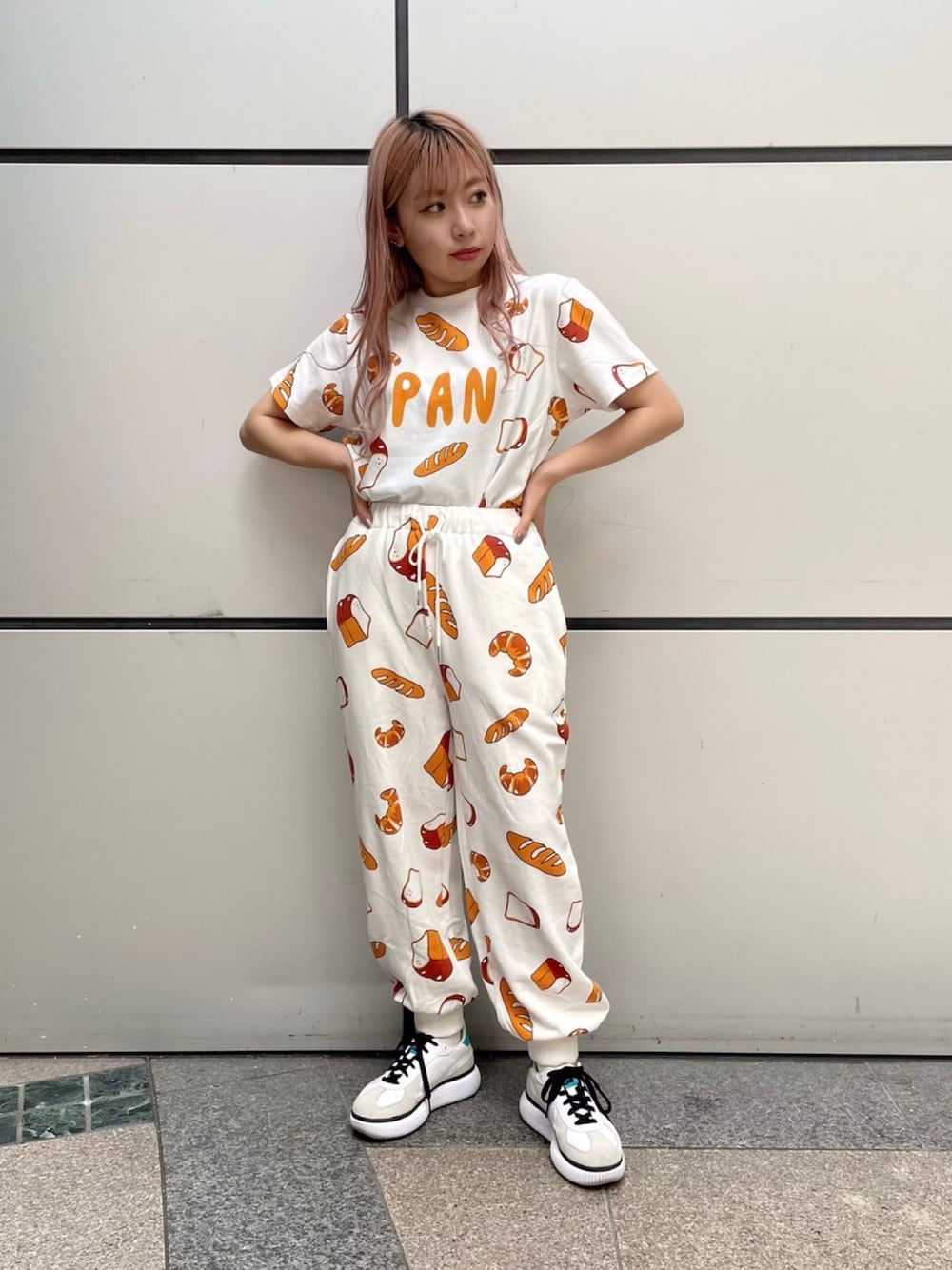 パン柄のTシャツとスウェットパンツの セットアップコーデ🥐🥯🍞🥖 おそろいコーデやおうちコーデにもオススメ🤎