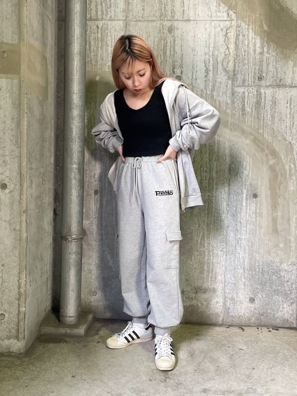 グレーのパーカーとカーゴスウェットパンツで セットアップ風のコーデに👟 男女共にオススメなコーデ✌️