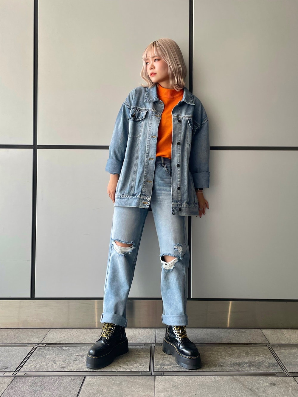 デニムジャケットとダメージデニムを セットアップ風なコーデに👖 インナーにはビタミンカラーのニットをin🍊 オシャレ上級者コーデに😘