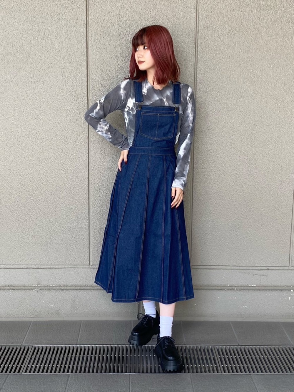 ジャンスカにタイダイ柄メロウトップスをインして ちょっぴり大人なガーリーコーデに♪ デニムのジャンスカはインナーを変えれば オールシーズン使えるアイテム😍
