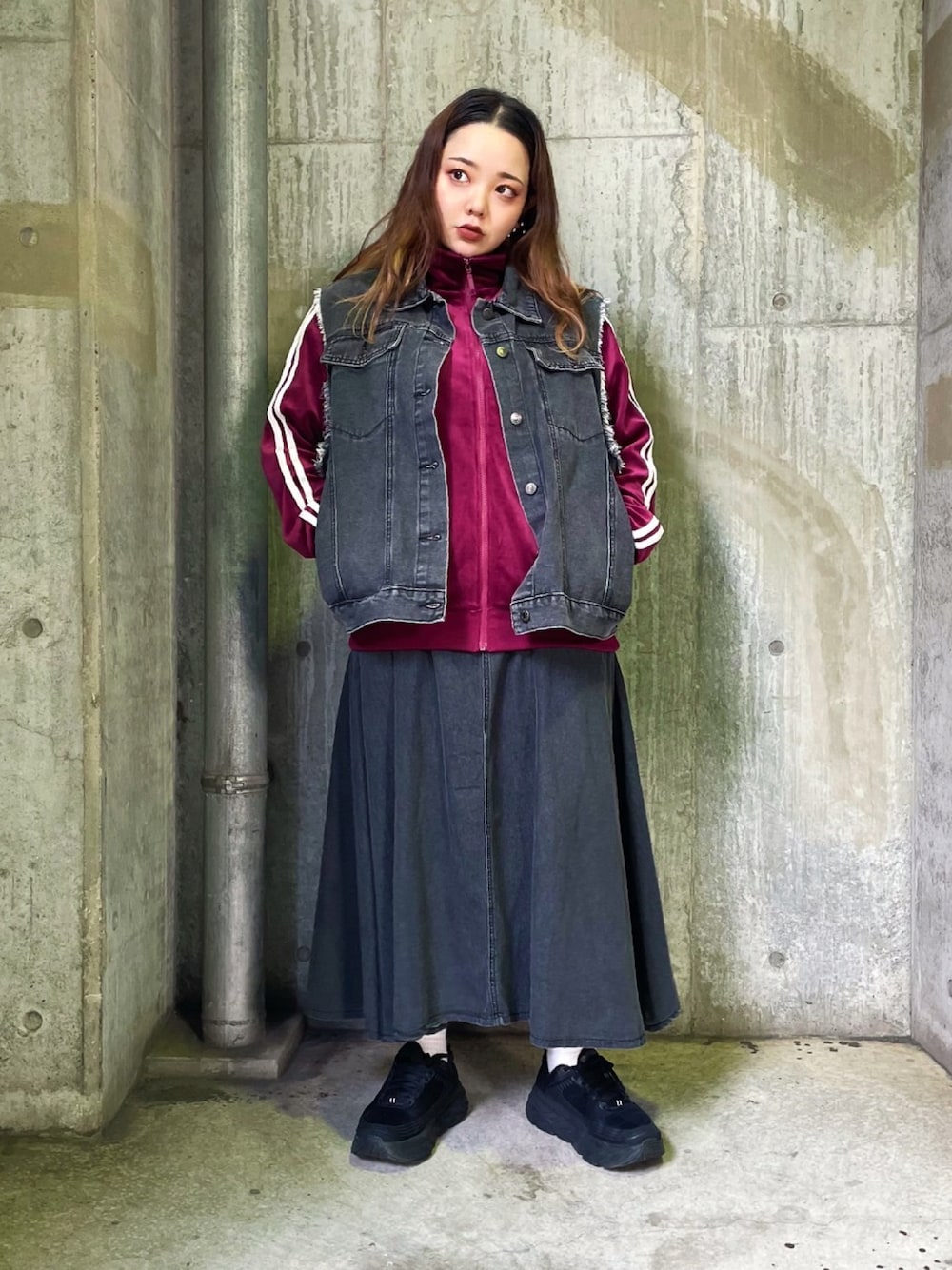 デニムスカートでガーリー要素も入れつつ ジャージにデニムベストをあわせた 個性派コーデ😉🌟