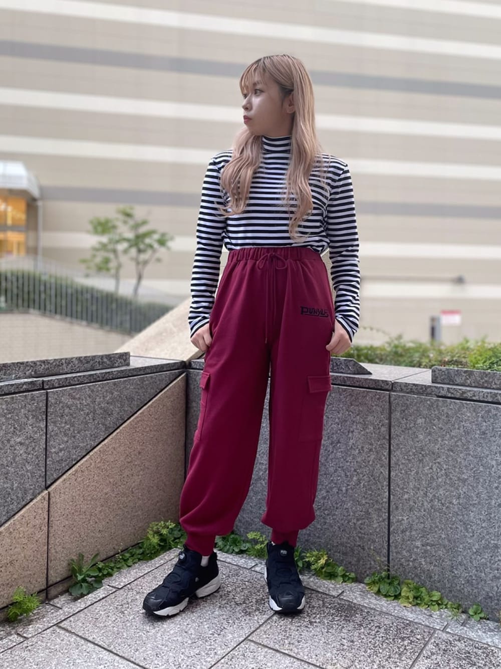 珍しいカラーのカーゴスウェットパンツは コーデのメインになってくれるアイテム😍 ボーダーTシャツをあわせて ラフなカジュアルストリートコーデに👟