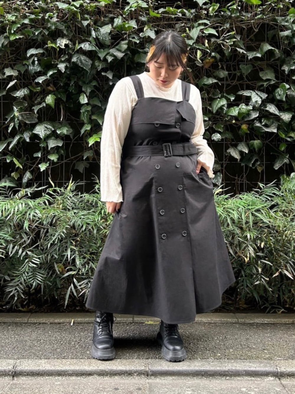 トレンチ風ワンピが大人かわいいコーデ🖤 トップスにはプリーツロンTを合わせ シンプルながらもこなれ感のあるコーデに✨