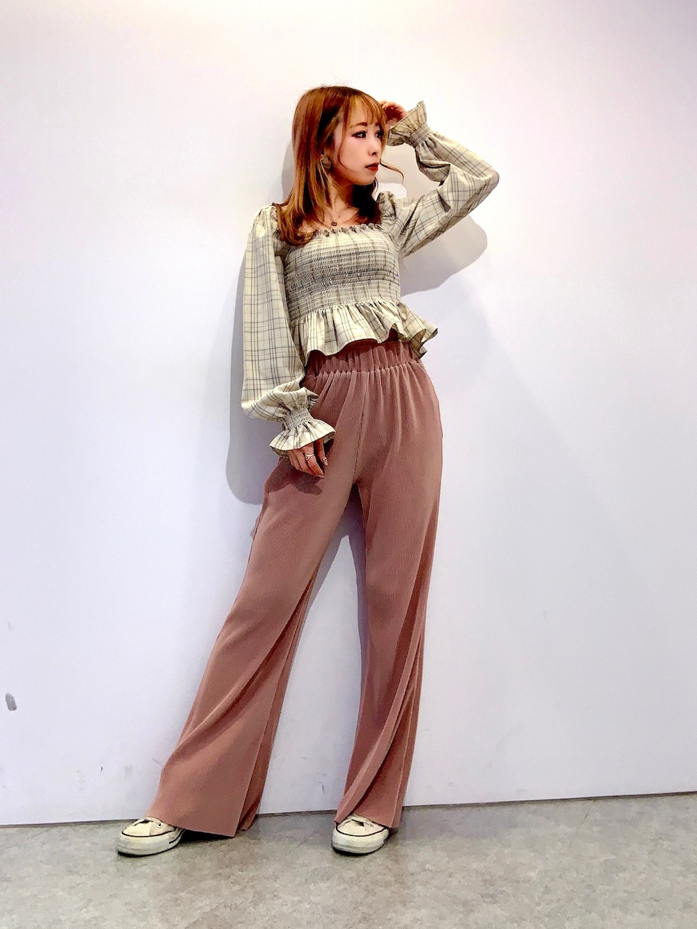 チェックのシャーリングブラウスは ガーリーコーデにピッタリ♪ 2wayでオフショルで着ても🍒◎ プリーツパンツを合わせて ちょっぴり大人な春のガーリーコーデに🌸