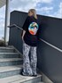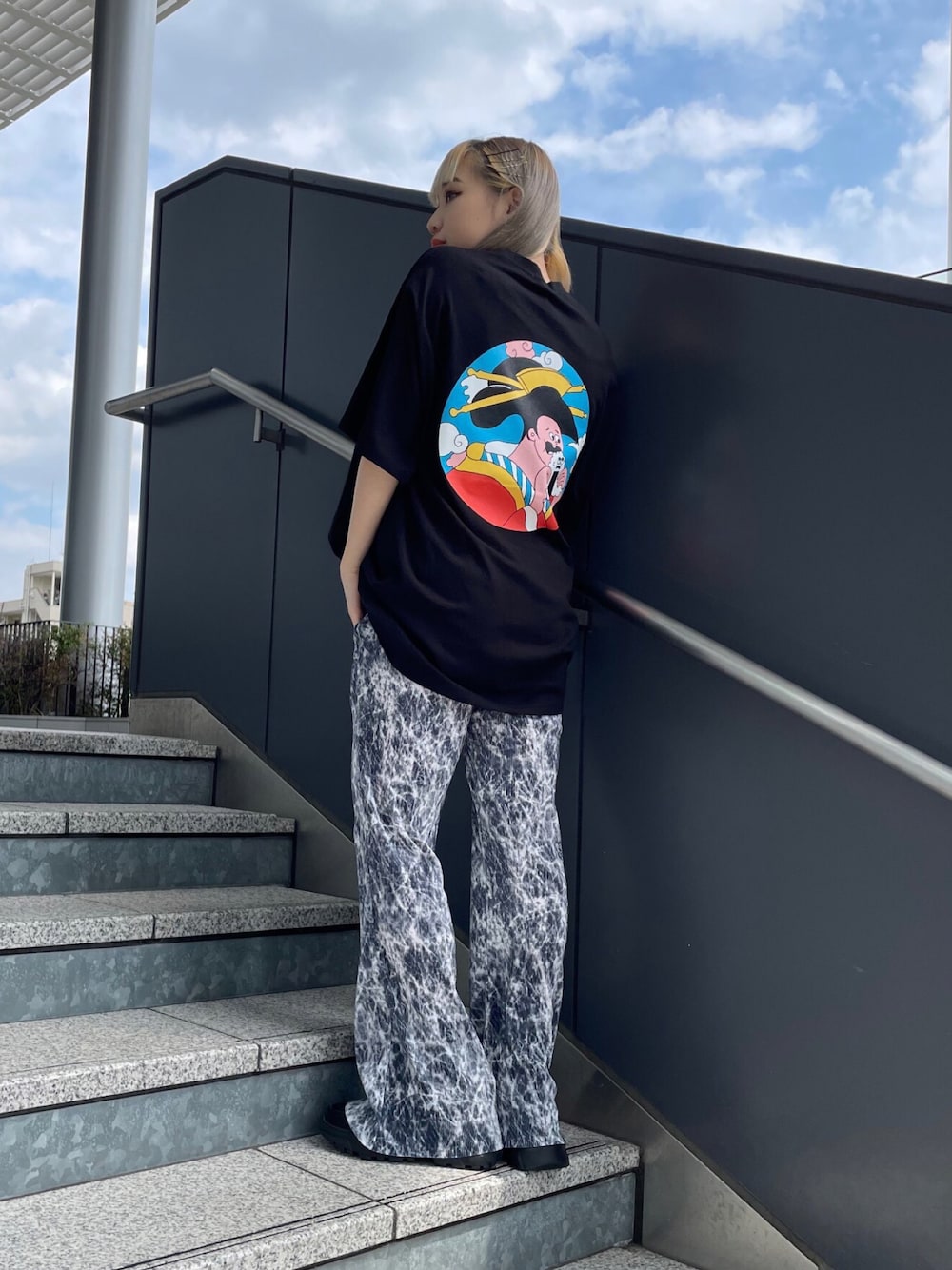 バックプリントが印象的なビッグTシャツ🖤 前面はシンプルなので柄物のボトムスも相性◎ タイダイ柄のパンツを合わせて夏らしいコーデに🫧