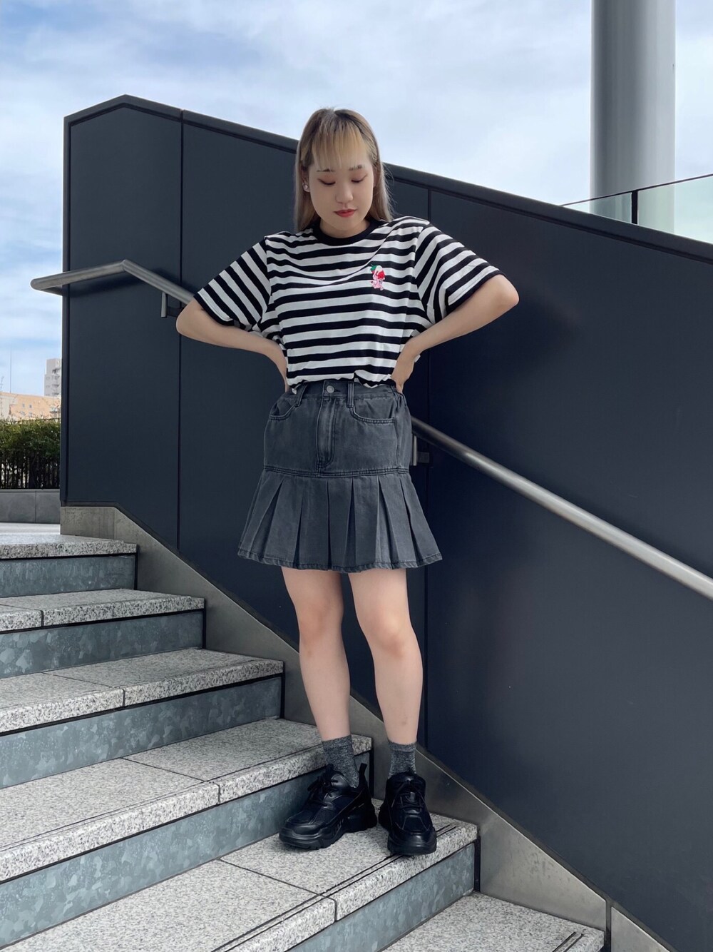 モノトーンでシンプルめなコーデですが デニムのプリーツスカートがコーデの主役に🖤 カジュアルガーリーなコーデに( ˙꒳˙ )b