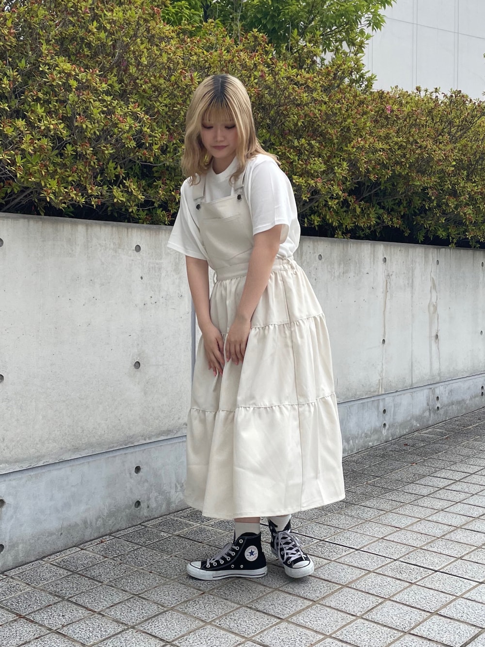 ホワイトでまとめたガーリーコーデ🤍 ボリュームのあるスカートが コーデの主役にっ😍✨ サロペットは2wayになっていて スカートとしても履けちゃいます🫶🏻