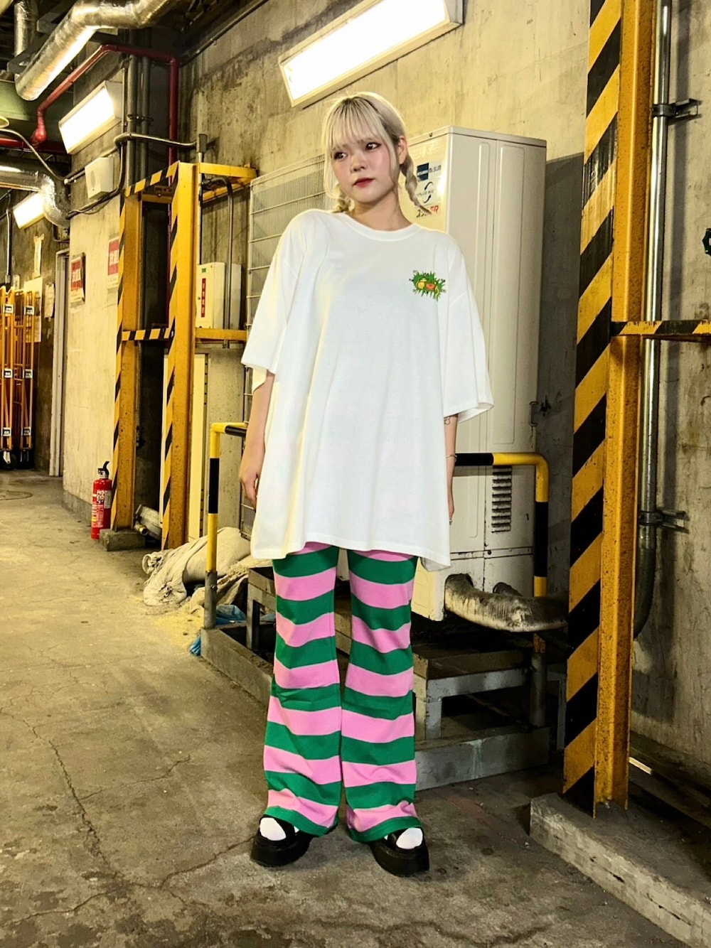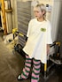 フロントは一見シンプルなTシャツ バッグプリントが個性的でかわいい😍 派手派手ボーダーのフレアパンツを合わせて 個性派コーデに🌈💗💚