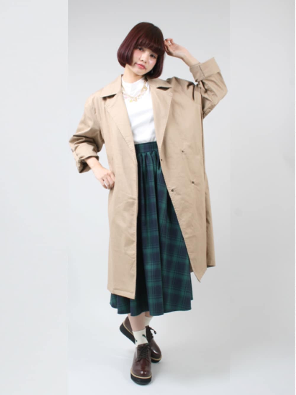 PUNYUSの定番アウター! ベージュのツイルコートは 抜群の使いやすさ◎ ハイネックの首元には ポイントでチャームアクセを♪
