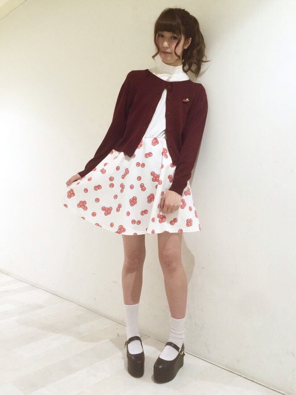 プニュズのフード合わせコーデ! カーディガンは胸に イクラ軍艦のワンポイント刺繍♪ ハイネックのワンピースも胸にワンポイントと、スカート部分はイクラ粒の総柄プリント♪ ユーモアで可愛いイクラコーデの完成◎