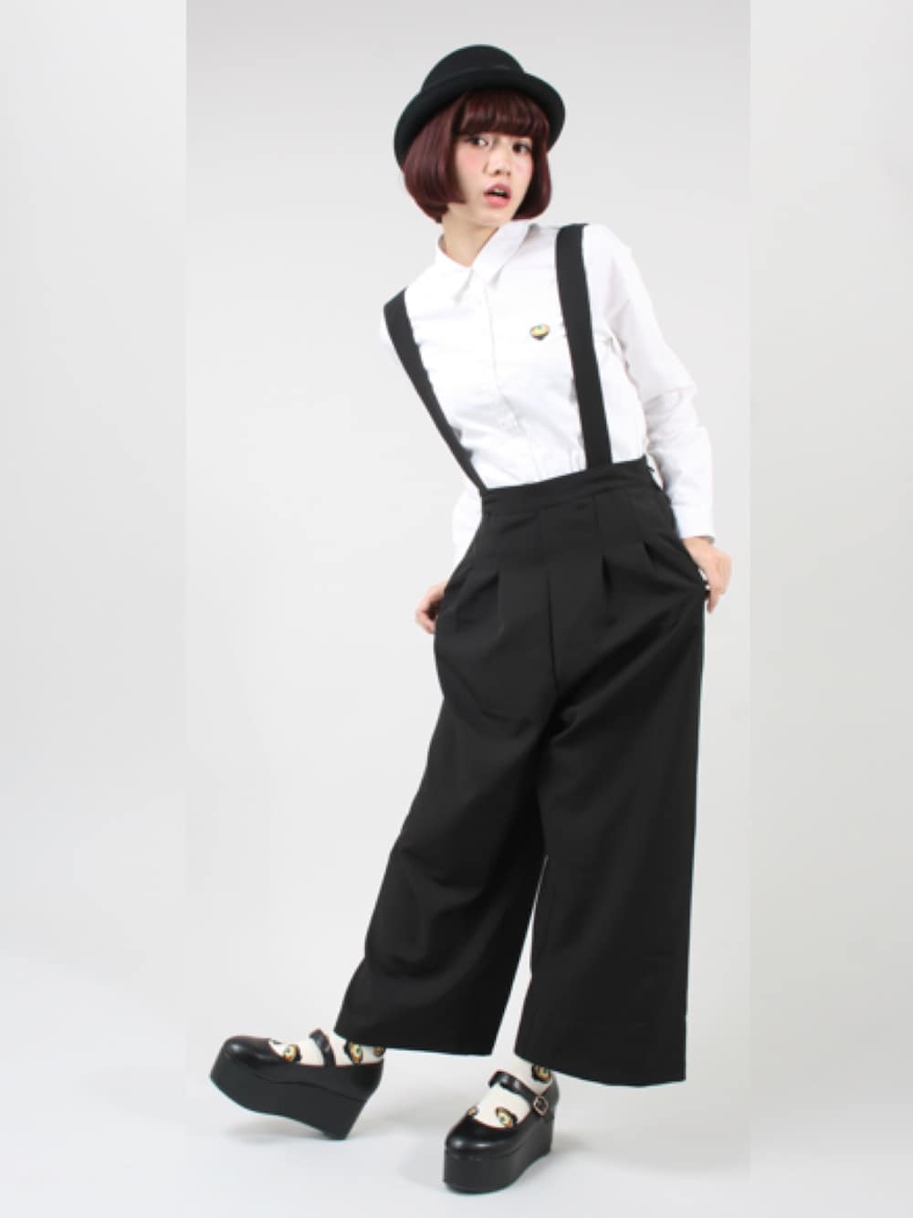 少しワイドシルエットの サスペンダー付きパンツに カツ丼ワンポイント刺繍のシャツ♪ 足元にはカツ丼総柄ソックス♪ を、合わせたカツコーデ!! ワンポイントや靴下チラ見せで さりげなくカツ〜♪♪