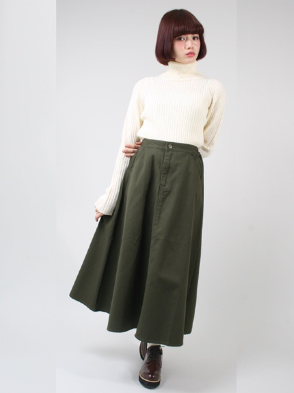 今季の定番ツイルスカートは ロング丈!楽ちんで、体型カバーも出来ます♪ カーキのロンスカにタートルネックを合わせて簡単トレンドコーデ◎
