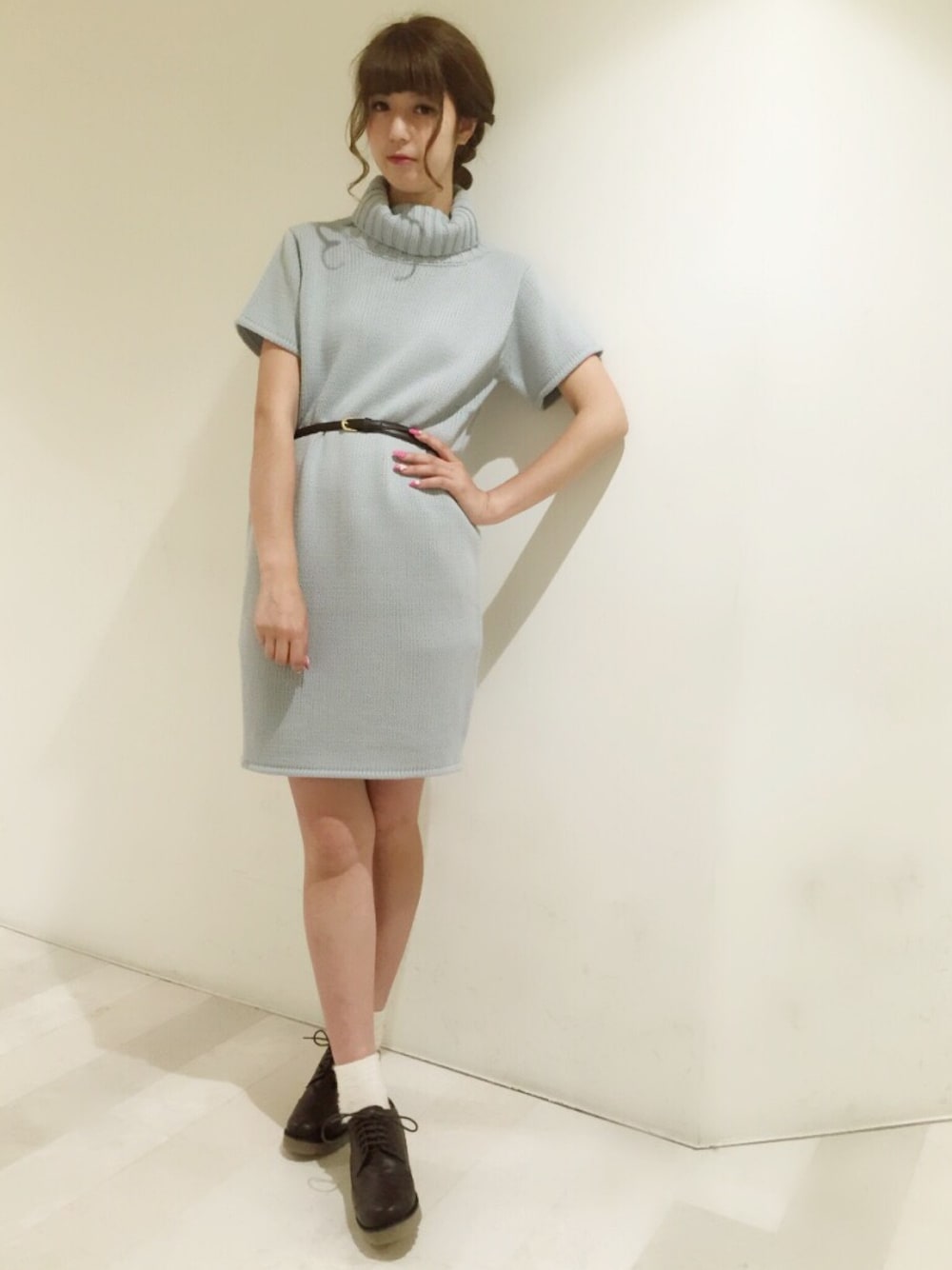 パステルカラーのニットワンピは タートルネックだけど半袖でスッキリ軽く♪細ベルトでウエストマーク! 合わせるアウターはロング丈がおすすめです◎