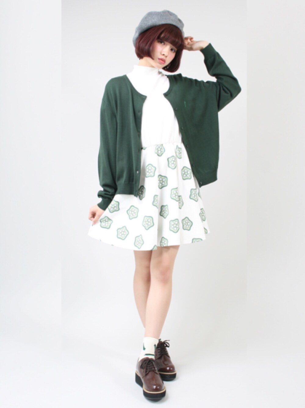 オクラのワンポイントカーデに、オクラ輪切りプリントのワンピースに、オクラの総柄ソックスで、 HAPPYなOKURAコーデ♪♪♪ 他にイクラ柄、カツ柄もあります★