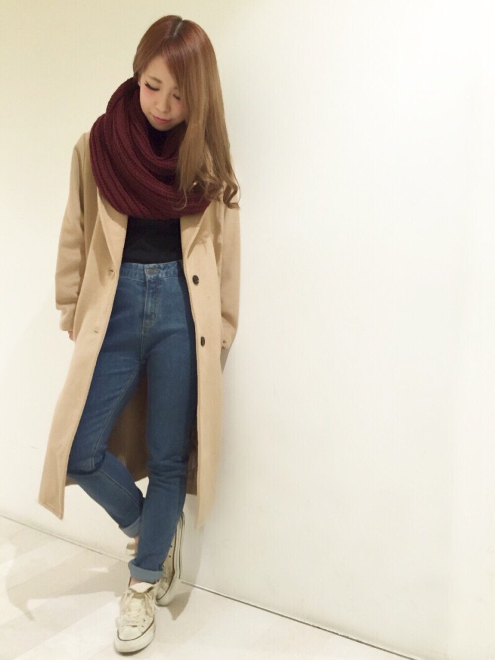 ショールカラーコート✖️スキニーで 大人スタイル◎ 足元はコンバースのスニーカーでハズしました♪