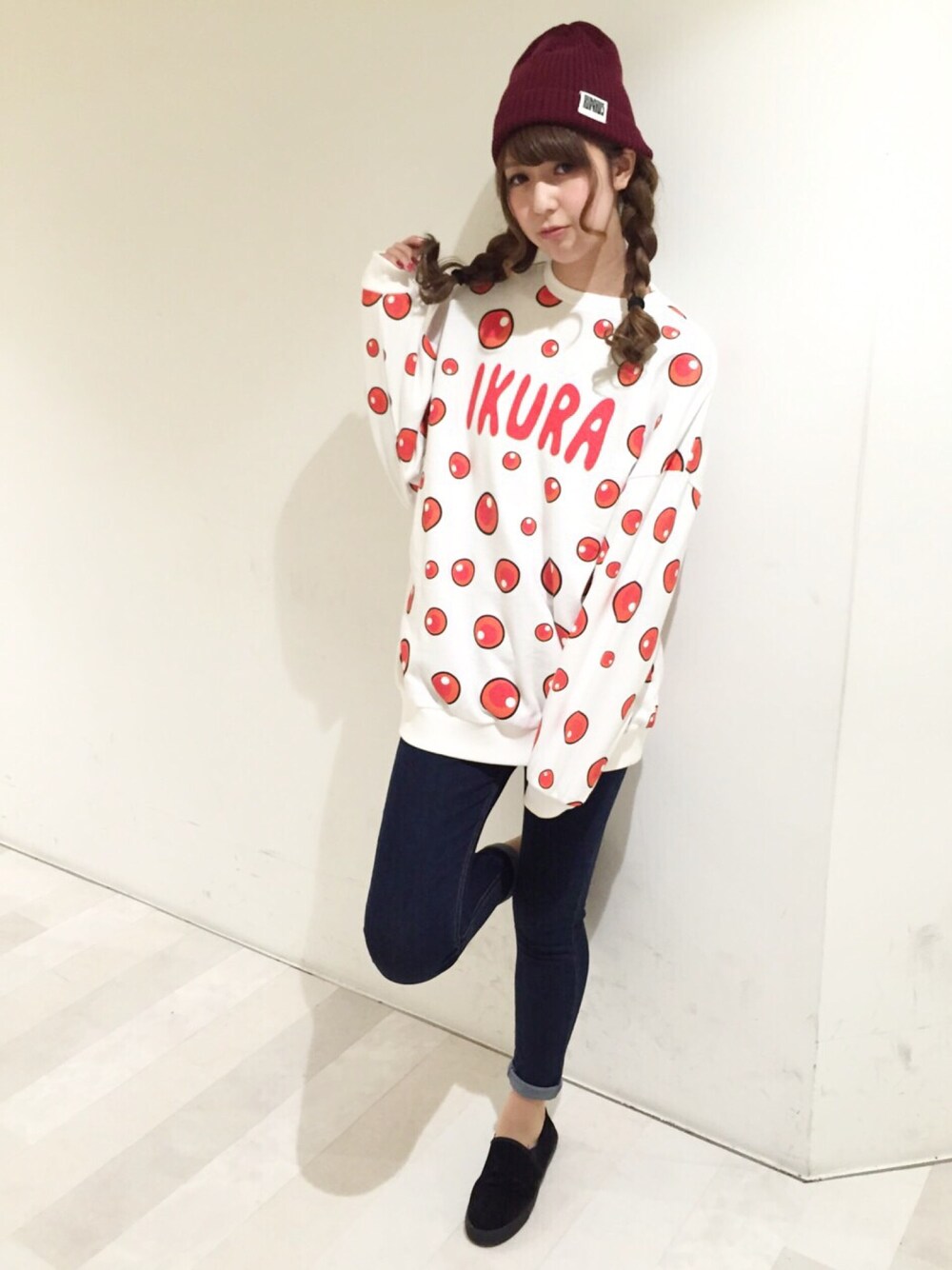 イクラの総柄スウェットを スキニーで合わせた楽ちんコーデ♪♪ ニットキャップの色目も合わせて◎ 足元もスリッポンやスニーカーでアクティブに☆